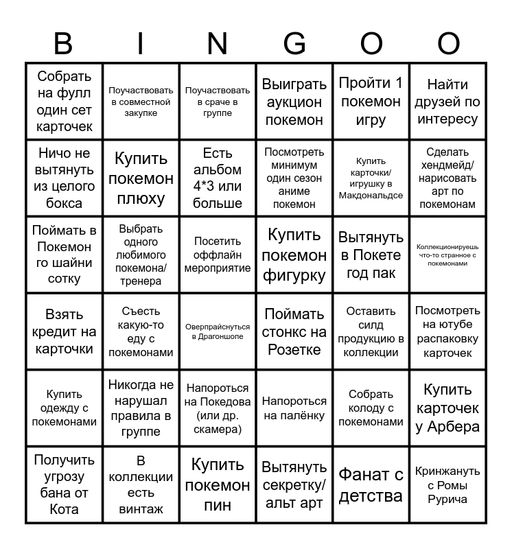 This bingo card has 36 words: Напороться на палёнку, Напороться на Покедова (или др. скамера), Вытянуть секретку/альт арт, Ничо не вытянуть из целого бокса, Взять кредит на карточки, Купить покемон фигурку, Купить покемон плюху, Купить покемон пин, Пройти 1 покемон игру, Собрать колоду с покемонами, Сделать хендмейд/нарисовать арт по покемонам, Выиграть аукцион покемон, Купить карточек у Арбера, Выбрать одного любимого покемона/тренера, Посмотреть минимум один сезон аниме покемон, Собрать на фулл один сет карточек, Купить одежду с покемонами, Вытянуть в Покете год пак, Поймать в Покемон го шайни сотку, Поучаствовать в сраче в группе, Посетить оффлайн мероприятие, Съесть какую-то еду с покемонами, Поймать стонкс на Розетке, Оверпрайснуться в Драгоншопе, Оставить силд продукцию в коллекции, Поучаствовать в совместной закупке, Купить карточки/игрушку в Макдональдсе, В коллекции есть винтаж, Есть альбом 4*3 или больше, Найти друзей по интересу, Кринжануть с Ромы Рурича, Получить угрозу бана от Кота, Посмотреть на ютубе распаковку карточек, Коллекционируешь что-то странное с покемонами, Никогда не нарушал правила в группе and Фанат с детства.