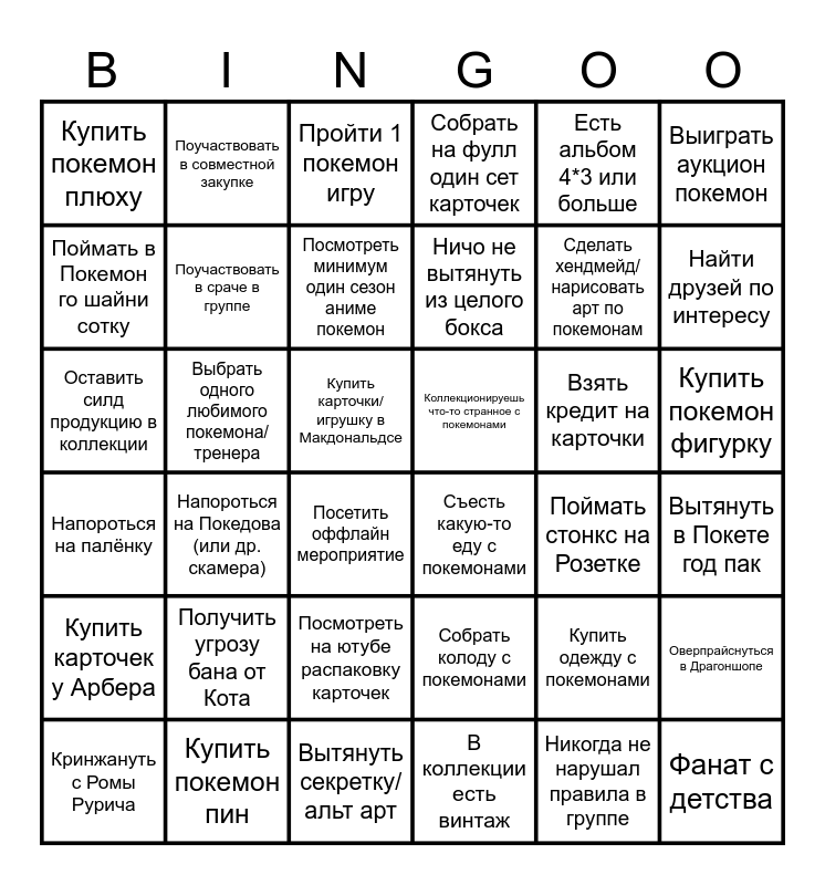 This bingo card has 36 words: Напороться на палёнку, Напороться на Покедова (или др. скамера), Вытянуть секретку/альт арт, Ничо не вытянуть из целого бокса, Взять кредит на карточки, Купить покемон фигурку, Купить покемон плюху, Купить покемон пин, Пройти 1 покемон игру, Собрать колоду с покемонами, Сделать хендмейд/нарисовать арт по покемонам, Выиграть аукцион покемон, Купить карточек у Арбера, Выбрать одного любимого покемона/тренера, Посмотреть минимум один сезон аниме покемон, Собрать на фулл один сет карточек, Купить одежду с покемонами, Вытянуть в Покете год пак, Поймать в Покемон го шайни сотку, Поучаствовать в сраче в группе, Посетить оффлайн мероприятие, Съесть какую-то еду с покемонами, Поймать стонкс на Розетке, Оверпрайснуться в Драгоншопе, Оставить силд продукцию в коллекции, Поучаствовать в совместной закупке, Купить карточки/игрушку в Макдональдсе, В коллекции есть винтаж, Есть альбом 4*3 или больше, Найти друзей по интересу, Кринжануть с Ромы Рурича, Получить угрозу бана от Кота, Посмотреть на ютубе распаковку карточек, Коллекционируешь что-то странное с покемонами, Никогда не нарушал правила в группе and Фанат с детства.