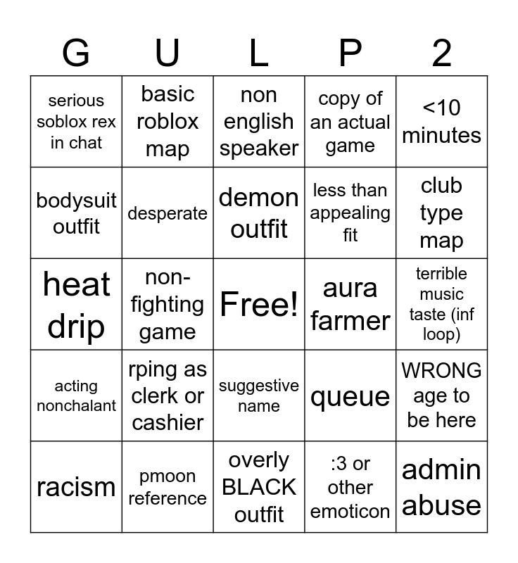 This bingo card has a free space and 24 words: rping as clerk or cashier, pmoon reference, demon outfit, racism, <10 minutes, serious soblox rex in chat, bodysuit outfit, basic roblox map, aura farmer, suggestive name, less than appealing fit, heat drip, queue, WRONG age to be here, desperate, :3 or other emoticon, terrible music taste (inf loop), non english speaker, club type map, non-fighting game, admin abuse, acting nonchalant, copy of an actual game and overly BLACK outfit.