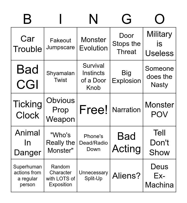 This bingo card has a free space and 34 words: Someone Dies, Aliens?, A Final Girl, Monster Battle!, Animal In Danger, Shyamalan Twist, Military is Useless, Superhuman actions from a regular person, Fakeout Jumpscare, Authority Doesn't Believe Someone, Survival Instincts of a Door Knob, Monster Evolution, Bigger Fish, Random Nudity, Narration, Someone does the Nasty, Random Character with LOTS of Exposition, Ticking Clock, "Who's Really the Monster", Bad Acting, Phone's Dead/Radio Down, Goofy Character Name, Car Trouble, Monster POV, Unnecessary Split-Up, Deus Ex-Machina, Door Stops the Threat, Know-It-All, Big Explosion, Bad CGI, Repeated Scene, Obvious Prop Weapon, Tell Don't Show and Infinite Ammo.