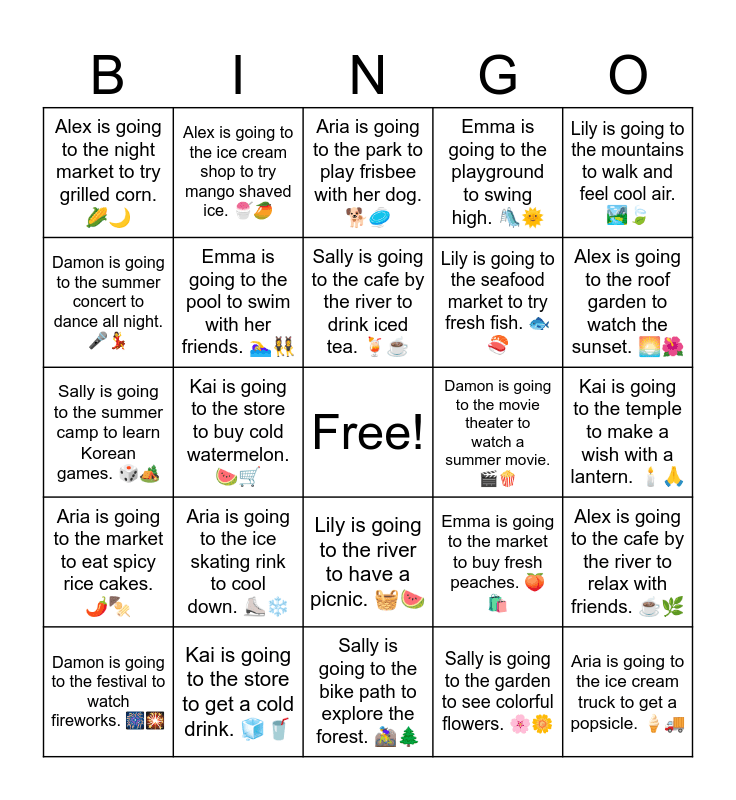 This bingo card has a free space and 33 words: Damon is going to the beach to make a big sandcastle. ๐๏ธ๐ฐ, Alex is going to the water park to play in the water. ๐ฆ๐, Kai is going to the store to buy cold watermelon. ๐๐, Sally is going to the park by the river to ride her bike. ๐ดโโ๏ธ๐ณ, Aria is going to the market to eat spicy rice cakes. ๐ถ๏ธ๐ข, Emma is going to the pool to swim with her friends. ๐โโ๏ธ๐ฏโโ๏ธ, Lily is going to the mountains to walk and feel cool air. ๐๏ธ๐, Damon is going to the festival to watch fireworks. ๐๐, Alex is going to the ice cream shop to try mango shaved ice. ๐ง๐ฅญ, Kai is going to the old village to see the lantern lights. ๐ฎโจ, Sally is going to the cafe by the river to drink iced tea. ๐นโ, Aria is going to the park to play frisbee with her dog. ๐๐ฅ, Emma is going to the library to read summer storybooks. ๐โ๏ธ, Lily is going to the beach volleyball court to play with friends. ๐๐๏ธ, Damon is going to the movie theater to watch a summer movie. ๐ฌ๐ฟ, Alex is going to the roof garden to watch the sunset. ๐ ๐บ, Kai is going to the store to get a cold drink. ๐ง๐ฅค, Sally is going to the summer camp to learn Korean games. ๐ฒ๐๏ธ, Aria is going to the ice skating rink to cool down. โธ๏ธโ๏ธ, Emma is going to the market to buy fresh peaches. ๐๐๏ธ, Lily is going to the river to have a picnic. ๐งบ๐, Damon is going to the water slide park to race friends. ๐ฆ๐โโ๏ธ, Alex is going to the night market to try grilled corn. ๐ฝ๐, Kai is going to the temple to make a wish with a lantern. ๐ฏ๏ธ๐, Sally is going to the bike path to explore the forest. ๐ตโโ๏ธ๐ฒ, Aria is going to the ice cream truck to get a popsicle. ๐ฆ๐, Emma is going to the playground to swing high. ๐๐, Lily is going to the seafood market to try fresh fish. ๐๐ฃ, Damon is going to the summer concert to dance all night. ๐ค๐, Alex is going to the cafe by the river to relax with friends. โ๐ฟ, Kai is going to the street food festival to try spicy chicken. ๐๐ฅ, Sally is going to the garden to see colorful flowers. ๐ธ๐ผ and Aria is going to the roof pool to swim under the stars. ๐โโ๏ธ๐.
