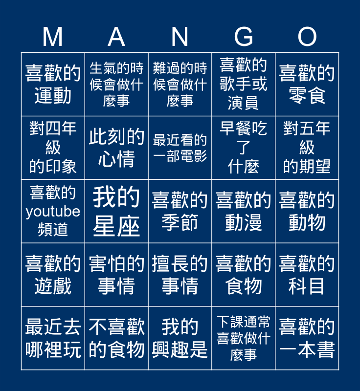 This bingo card has 25 words: 害怕的事情, 我的 興趣是, 最近看的 一部電影, 最近去哪裡玩, 喜歡的零食, 喜歡的運動, 對四年級 的印象, 生氣的時候會做什麼事, 喜歡的動漫, 擅長的事情, 早餐吃了 什麼, 喜歡的youtube頻道, 喜歡的食物, 喜歡的科目, 此刻的心情, 喜歡的一本書, 喜歡的動物, 難過的時候會做什麼事, 對五年級 的期望, 我的星座, 喜歡的季節, 不喜歡的食物, 喜歡的遊戲, 喜歡的歌手或演員 and 下課通常喜歡做什麼事.
