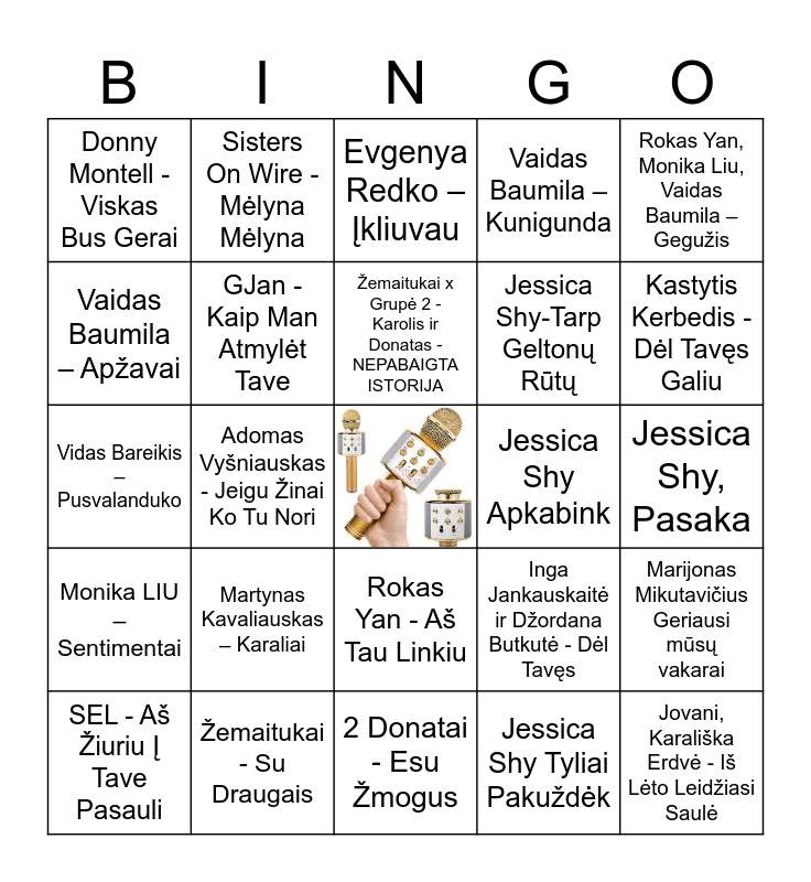This bingo card has a free space and 31 words: 2 Donatai - Esu Žmogus, 69 Danguje – Gyvenu, Adomas Vyšniauskas - Jeigu Žinai Ko Tu Nori, Delfinai Ačiū tau, Donny Montell - Viskas Bus Gerai, Evgenya Redko – Įkliuvau, GJan - Kaip Man Atmylėt Tave, Inga Jankauskaitė ir Džordana Butkutė - Dėl Tavęs, Jessica Shy Apkabink, Jessica Shy Tyliai Pakuždėk, Jessica Shy, Pasaka, Jovani, Karališka Erdvė - Iš Lėto Leidžiasi Saulė, JUSTINAS JARUTIS ROKAS YAN SKAMBINAU BAZNYCIAI, JUSTINAS JARUTIS Tūkstančiai žingsnių, Kastytis Kerbedis - Dėl Tavęs Galiu, Liepa - Ar mylėtum, Marijonas Mikutavičius Geriausi mūsų vakarai, Martynas Kavaliauskas – Karaliai, Monika LIU – Sentimentai, Rokas Yan - Aš Tau Linkiu, Rokas Yan, Monika Liu, Vaidas Baumila – Gegužis, Saulius Prūsaitis - Norim šokti, SEL - Aš Žiuriu Į Tave Pasauli, Sisters On Wire - Mėlyna Mėlyna, Jessica Shy-Tarp Geltonų Rūtų, Vaidas Baumila – Apžavai, Vaidas Baumila – Kunigunda, Vidas Bareikis – Pusvalanduko, Žemaitukai - Su Draugais, Žemaitukai x Grupė 2 - Karolis ir Donatas - NEPABAIGTA ISTORIJA and Monika LIU - Šampanas (bul bul bul).