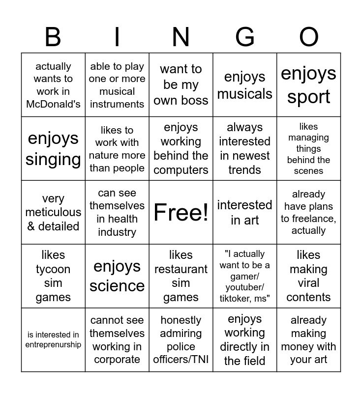 This bingo card has a free space and 29 words: is interested in entreprenurship, people-pleasing, can see themselves in health industry, wants to try dabbling as a barista sometimes, actually wants to work in McDonald's, want to be my own boss, likes to work with nature more than people, enjoys science, interested in art, cannot see themselves working in corporate, already have plans to freelance, actually, already making money with your art, honestly admiring police officers/TNI, enjoys working directly in the field, likes managing things behind the scenes, able to shadow-count without calculators, likes restaurant sim games, likes tycoon sim games, enjoys sport, very meticulous & detailed, "I actually want to be a gamer/ youtuber/ tiktoker, ms", enjoys arts & crafts, always interested in newest trends, enjoys singing, enjoys musicals, able to play one or more musical instruments, likes making viral contents, enjoys working behind the computers and don't like getting dirty.