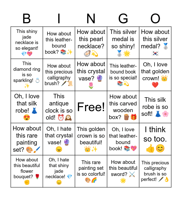 This bingo card has a free space and 34 words: How about this golden crown? ๐โจ, How about this beautiful sword? โ๏ธ๐, How about this shiny jade necklace? ๐๐ธ, How about this silk robe? ๐๐ธ, How about this rare painting set? ๐จ๐๏ธ, How about this precious calligraphy brush? ๐๏ธ๐, How about this silver medal? ๐ฅ๐ฐ๐ท, How about this beautiful flower bouquet? ๐นโ, How about this leather-bound book? ๐โจ, How about this diamond ring? ๐๐, How about this crystal vase? ๐ฎ๐ท, How about this pearl necklace? ๐ฆช๐ซ, How about this silk fan? ๐ฌ๏ธ๐, How about this antique clock? โฐ๐ฐ๏ธ, How about this carved wooden box? ๐ชต๐, Oh, I love that golden crown! ๐โค๏ธ, Oh, I hate that shiny jade necklace! ๐๐, Oh, I love that silk robe! ๐๐, Oh, I hate that crystal vase! ๐ฎ๐ , Oh, I love that leather-bound book! ๐๐, This golden crown is so beautiful! ๐โจ, This beautiful sword is so strong! โ๏ธ๐ช, This shiny jade necklace is so elegant! ๐๐, This silk robe is so soft! ๐๐ธ, This rare painting set is so colorful! ๐จ๐, This precious calligraphy brush is so perfect! ๐๏ธ๐, This silver medal is so shiny! ๐ฅ๐, This beautiful flower bouquet is so lovely! ๐น๐, This leather-bound book is so special! ๐๐ซ, This diamond ring is so sparkling! ๐โจ, This pearl necklace is so pretty! ๐ฆช๐, This antique clock is so old! โฐ๐ฐ๏ธ, I think so too. ๐๐ and I don't think so. ๐คโ.