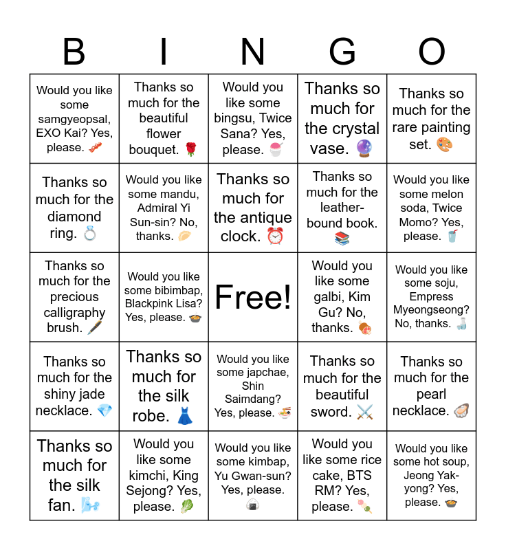 This bingo card has a free space and 30 words: Would you like some kimchi, King Sejong? Yes, please. 🥬, Would you like some tteokbokki, BTS Jungkook? No, thanks. 🌶️, Would you like some bibimbap, Blackpink Lisa? Yes, please. 🍲, Would you like some hotteok, IU? No, thanks. 🥞, Would you like some samgyeopsal, EXO Kai? Yes, please. 🥓, Would you like some bingsu, Twice Sana? Yes, please. 🍧, Would you like some mandu, Admiral Yi Sun-sin? No, thanks. 🥟, Would you like some japchae, Shin Saimdang? Yes, please. 🍜, Would you like some galbi, Kim Gu? No, thanks. 🍖, Would you like some kimbap, Yu Gwan-sun? Yes, please. 🍙, Would you like some soju, Empress Myeongseong? No, thanks. 🍶, Would you like some hot soup, Jeong Yak-yong? Yes, please. 🍲, Would you like some rice cake, BTS RM? Yes, please. 🍡, Would you like some fried chicken, Blackpink Jennie? No, thanks. 🍗, Would you like some melon soda, Twice Momo? Yes, please. 🥤, Thanks so much for the golden crown. 👑, Thanks so much for the beautiful sword. ⚔️, Thanks so much for the shiny jade necklace. 💎, Thanks so much for the silk robe. 👗, Thanks so much for the rare painting set. 🎨, Thanks so much for the precious calligraphy brush. 🖋️, Thanks so much for the silver medal. 🥈, Thanks so much for the beautiful flower bouquet. 🌹, Thanks so much for the leather-bound book. 📚, Thanks so much for the diamond ring. 💍, Thanks so much for the crystal vase. 🔮, Thanks so much for the pearl necklace. 🦪, Thanks so much for the silk fan. 🌬️, Thanks so much for the antique clock. ⏰ and Thanks so much for the carved wooden box. 🪵.