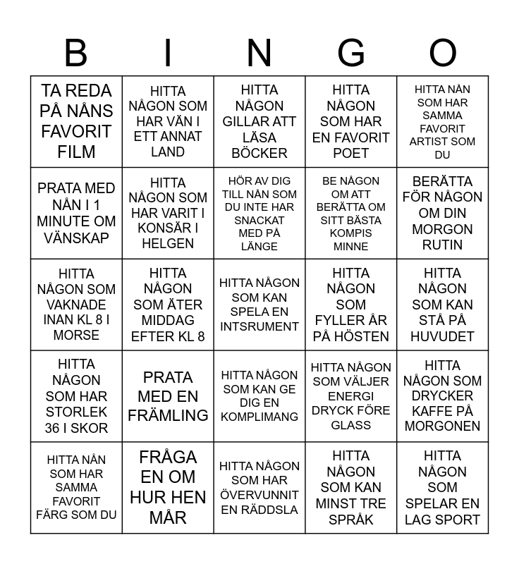 This bingo card has a free space and 24 words: PRATA MED EN FRÄMLING, FRÅGA EN OM HUR HEN MÅR, HÖR AV DIG TILL NÅN SOM DU INTE HAR SNACKAT MED PÅ LÄNGE, HITTA NÅN SOM HAR SAMMA FAVORIT FÄRG SOM DU, HITTA NÅN SOM HAR SAMMA FAVORIT ARTIST SOM DU, TA REDA PÅ NÅNS FAVORIT FILM, PRATA MED NÅN I 1 MINUTE OM VÄNSKAP, HITTA NÅGON SOM HAR VÄN I ETT ANNAT LAND, HITTA NÅGON SOM FYLLER ÅR PÅ HÖSTEN, HITTA NÅGON SOM KAN GE DIG EN KOMPLIMANG, BE NÅGON OM ATT BERÄTTA OM SITT BÄSTA KOMPIS MINNE, HITTA NÅGON SOM VAKNADE INAN KL 8 I MORSE, HITTA NÅGON SOM VÄLJER ENERGI DRYCK FÖRE GLASS, HITTA NÅGON SOM DRYCKER KAFFE PÅ MORGONEN, HITTA NÅGON SOM HAR VARIT I KONSÄR I HELGEN, HITTA NÅGON SOM KAN MINST TRE SPRÅK, HITTA NÅGON SOM KAN STÅ PÅ HUVUDET, HITTA NÅGON GILLAR ATT LÄSA BÖCKER, BERÄTTA FÖR NÅGON OM DIN MORGON RUTIN, HITTA NÅGON SOM ÄTER MIDDAG EFTER KL 8, HITTA NÅGON SOM SPELAR EN LAG SPORT, HITTA NÅGON SOM HAR STORLEK 36 I SKOR, HITTA NÅGON SOM HAR EN FAVORIT POET and HITTA NÅGON SOM HAR ÖVERVUNNIT EN RÄDDSLA.