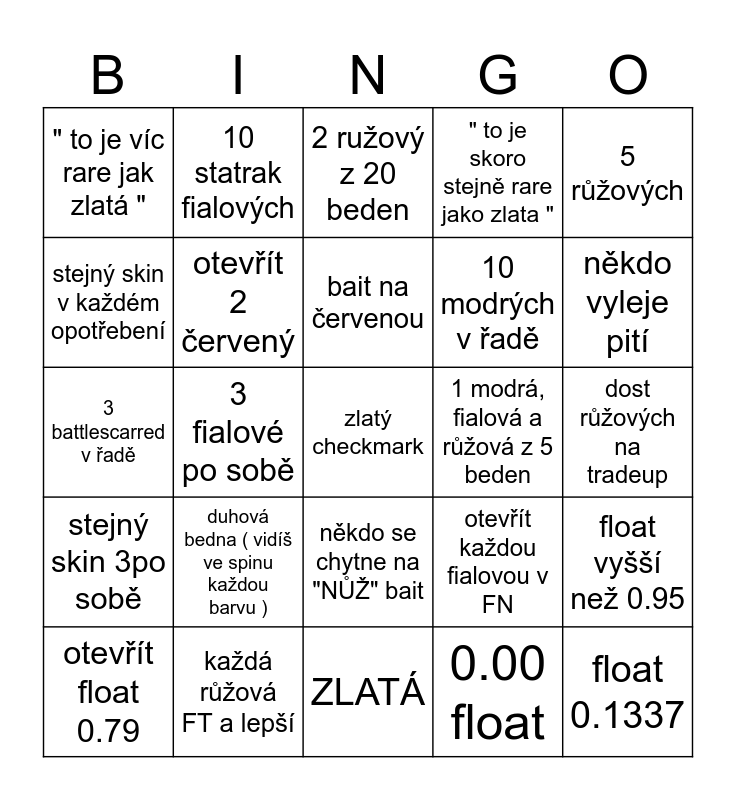 This bingo card has 25 words: stejný skin 3po sobě, každá růžová FT a lepší, zlatý checkmark, 0.00 float, 5 růžových, " to je víc rare jak zlatá ", 10 statrak fialových, 2 ružový z 20 beden, 1 modrá, fialová a růžová z 5 beden, float vyšší než 0.95, stejný skin v každém opotřebení, otevřít 2 červený, ZLATÁ, otevřít každou fialovou v FN, někdo vyleje pití, otevřít float 0.79, 3 fialové po sobě, bait na červenou, 10 modrých v řadě, dost růžových na tradeup, 3 battlescarred v řadě, duhová bedna ( vidíš ve spinu každou barvu ), někdo se chytne na "NŮŽ" bait, " to je skoro stejně rare jako zlata " and float 0.1337.