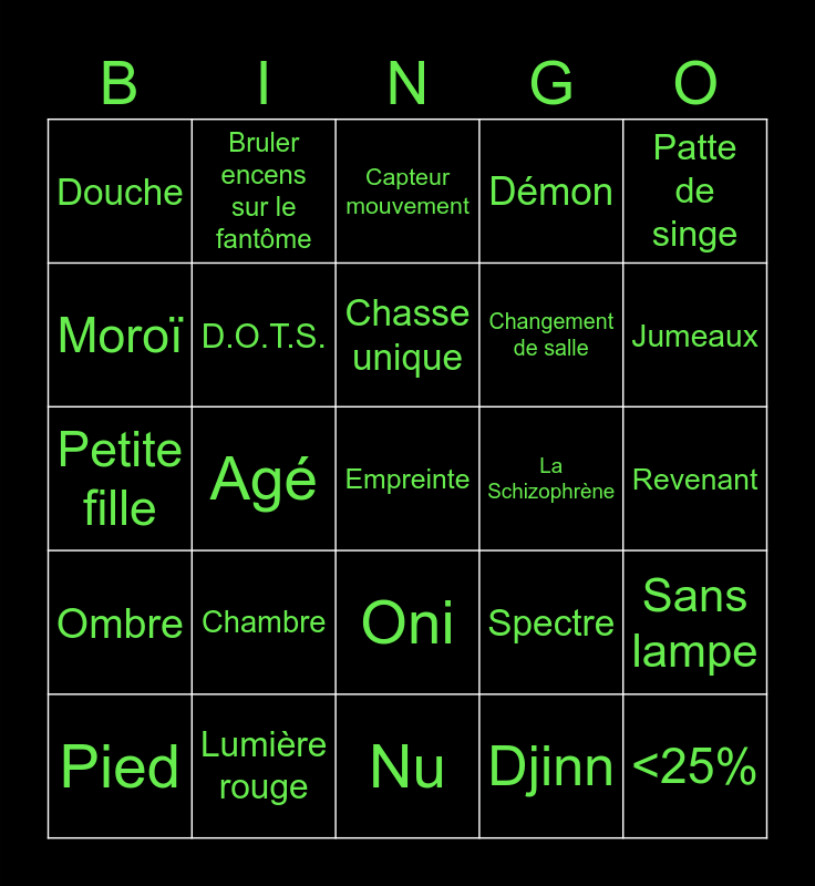This bingo card has 105 words: Tanglewood, Raiju, Patte de singe, Neige, EMF 5, Obake, Pluie, Salle de bain, Edgefield, TP Mannequin ou peluche, Température Glaciale, Cuisine, Fantôme, Crâne, Miroir, Cercle invocation, Capteur mouvement, Willow, Garage, Cage thoracique, Mimic, Esprit, Thayé, Cave, Poupée vaudou, Chambre, Jumeaux, Démon, Salon, Ridgeview, Spectre, Djinn, Bassin, Main, Boîte musique, Couloir, Tarot, Poltergeist, Chasse unique, Lumière rouge, Lumière qui explose, Ombre, Hantu, Moroï, Yokai, Douche, Alarme voiture / Piano, Empreinte, Pouvoir Fantôme, <25%, Deogen, Banshee, Cauchemar, Téléphone, Sans chasse, Sans preuve, Goryo, Myling, Onryo, Oni, Revenant, Yurei, Ouija, Bougie, Game parfaite, Photo du fantôme, Interdiction de se cacher pendant la chasse, Bruler encens sur le fantôme, Petite fille, Agé, Nu, Rempant, Disjoncteur, Game -10 min, Crucifix brulé à 100%, Gros lard, Jeune, Sadako, Pied, Cure-dent, Brouillard, Mâchoire, La vieille, D.O.T.S., Spirit Box, La Schizophrène, Orbe, Sel, Le Vieux, Porte, Ecriture, Fémur, Souffle, Micro parabolique, Sans lampe, Enregistreur, Bleasdale, Vidéo Chasse, Changement de salle, Grafton, Campement, Ballon, Télé / Rocking chair, Tarot sans mourir and Eau sale.