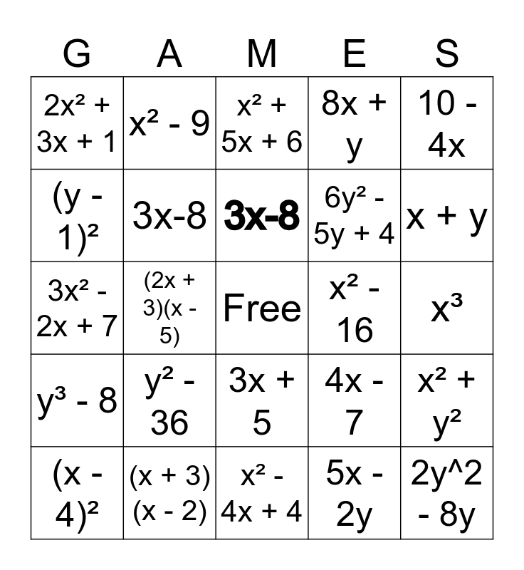 This bingo card has a free space and 26 words: 3x + 5, 5x - 2y, 3x-8, (x + 3)(x - 2), 10 - 4x, 2x² + 3x + 1, (y - 1)², x² - 9, x³, 4x - 7, 6y² - 5y + 4, 3x² - 2x + 7, x² + y², (x - 4)², (2x + 3)(x - 5), 7x² - 3x + 2, 8x + y, y³ - 8, x² + 5x + 6, 2y^2 - 8y, x + y, x² - 4x + 4, x² - 16, y² - 36, 3x-8 and 4x^2 - 25.