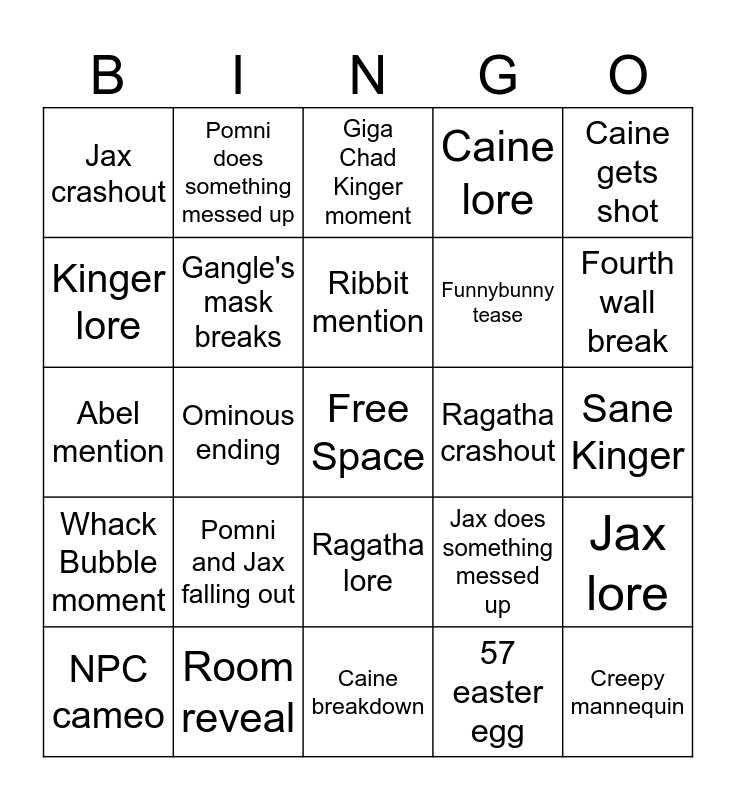 This bingo card has a free space and 25 words: Pomni and Jax falling out, Caine breakdown, Ribbit mention, NPC cameo, Caine gets shot, Jax crashout, Kinger lore, Pomni does something messed up, Ragatha crashout, Ragatha lore, Funnybunny tease, Abel mention, Jax does something messed up, Jax lore, Gangle's mask breaks, Something breaks/glitches, Sane Kinger, Giga Chad Kinger moment, Fourth wall break, Ominous ending, Creepy mannequin, Room reveal, Whack Bubble moment, Caine lore and 57 easter egg.