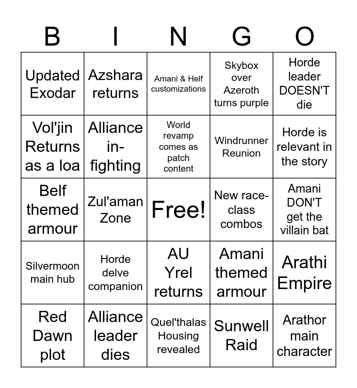 This bingo card has a free space and 24 words: Horde delve companion, Alliance leader dies, World revamp comes as patch content, Red Dawn plot, Horde leader DOESN'T die, Updated Exodar, Vol'jin Returns as a loa, Azshara returns, New race-class combos, AU Yrel returns, Windrunner Reunion, Belf themed armour, Amani themed armour, Arathi Empire, Alliance in-fighting, Sunwell Raid, Amani DON'T get the villain bat, Amani & Helf customizations, Horde is relevant in the story, Zul'aman Zone, Arathor main character, Silvermoon main hub, Skybox over Azeroth turns purple and Quel'thalas Housing revealed.