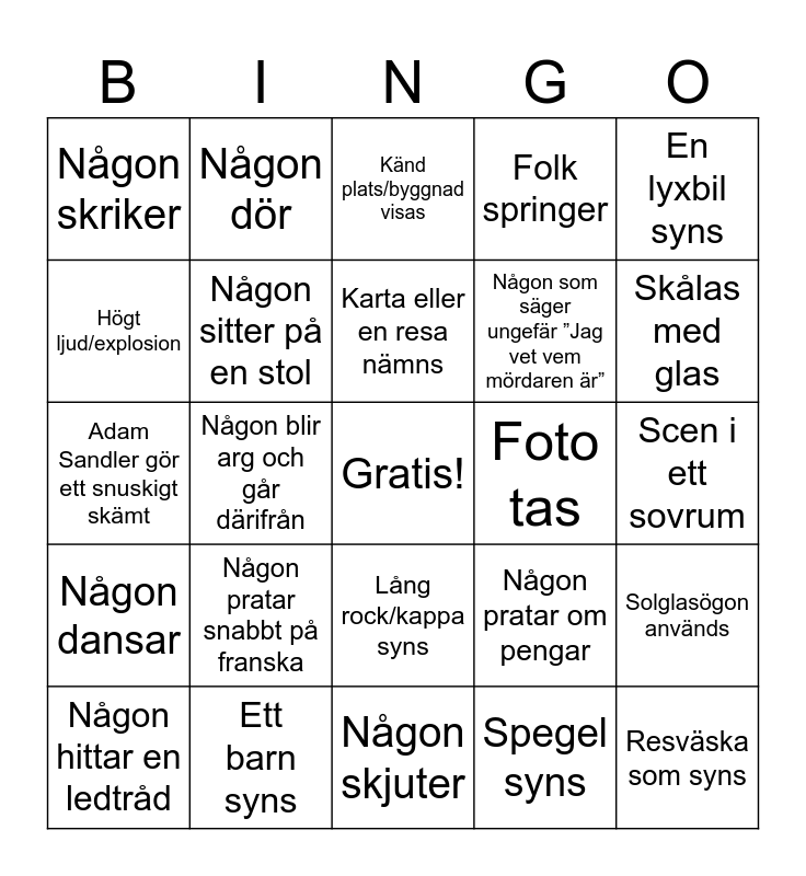 This bingo card has a free space and 24 words: Någon hittar en ledtråd, Någon pratar snabbt på franska, Karta eller en resa nämns, Spegel syns, En lyxbil syns, Någon skriker, Någon dör, Känd plats/byggnad visas, Foto tas, Scen i ett sovrum, Adam Sandler gör ett snuskigt skämt, Någon sitter på en stol, Någon pratar om pengar, Solglasögon används, Högt ljud/explosion, Ett barn syns, Någon skjuter, Folk springer, Skålas med glas, Någon dansar, Någon blir arg och går därifrån, Lång rock/kappa syns, Någon som säger ungefär ”Jag vet vem mördaren är” and Resväska som syns.