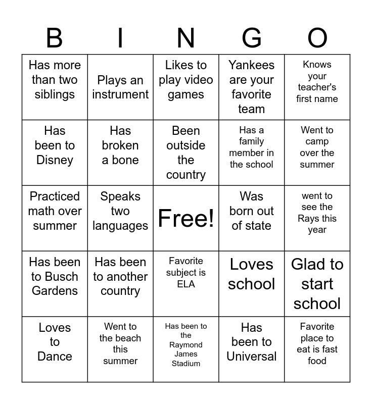 This bingo card has a free space and 29 words: Loves to Dance, Likes to read, Speaks two languages, Likes just pepperoni pizza, Has more than two siblings, Likes to play video games, Has broken a bone, Has been to another country, Was born out of state, Went to the beach this summer, went to see the Rays this year, Favorite place to eat is fast food, Has been to the Raymond James Stadium, Has been to Universal, Went to camp over the summer, Favorite subject is Math, Favorite subject is ELA, Has been to Busch Gardens, Knows your teacher's first name, Practiced math over summer, Loves school, Prefers dogs over cats, Has a family member in the school, Has been to Disney, Yankees are your favorite team, Plays an instrument, Glad to start school, Been outside the country and Like to play sports.