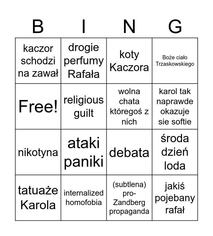This bingo card has 16 words: internalized homofobia, środa dzień loda, koty Kaczora, kaczor schodzi na zawał, nikotyna, drogie perfumy Rafała, debata, (subtlena) pro-Zandberg propaganda, Free!, religious guilt, tatuaże Karola, Boże ciało Trzaskowskiego, ataki paniki, karol tak naprawde okazuje sie softie, wolna chata któregoś z nich and jakiś pojebany rafał.