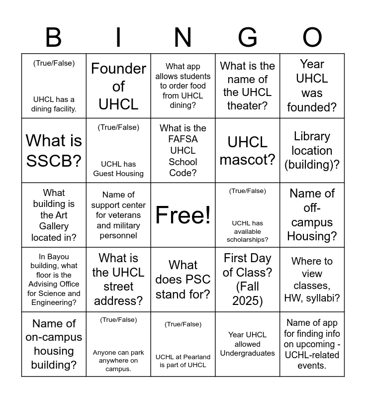 This bingo card has a free space and 24 words: What is the UHCL street address?, (True/False) Anyone can park anywhere on campus., What is the FAFSA UHCL School Code?, Name of on-campus housing building?, Year UHCL was founded?, (True/False) UHCL has a dining facility., What is SSCB?, Founder of UHCL, (True/False) UCHL has available scholarships?, What does PSC stand for?, UHCL mascot?, What building is the Art Gallery located in?, First Day of Class? (Fall 2025), Where to view classes, HW, syllabi?, (True/False) UCHL has Guest Housing, Year UHCL allowed Undergraduates, Name of off-campus Housing?, What app allows students to order food from UHCL dining?, Library location (building)?, Name of support center for veterans and military personnel, Name of app for finding info on upcoming -UCHL-related events., In Bayou building, what floor is the Advising Office for Science and Engineering?, What is the name of the UHCL theater? and (True/False) UCHL at Pearland is part of UHCL.