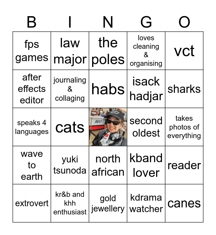 This bingo card has a free space and 24 words: yuki tsunoda, kr&b and khh enthusiast, habs, extrovert, vct, fps games, after effects editor, law major, second oldest, north african, isack hadjar, speaks 4 languages, kband lover, reader, journaling & collaging, kdrama watcher, takes photos of everything, the poles, sharks, cats, canes, wave to earth, loves cleaning & organising and gold jewellery.