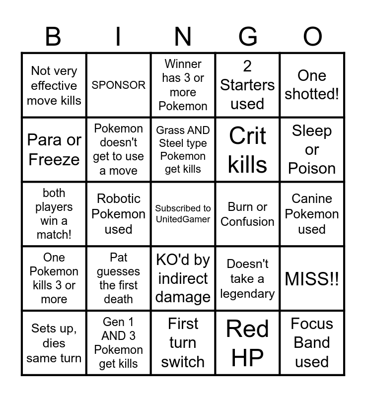 This bingo card has a free space and 24 words: Pat guesses the first death, Gen 1 AND 3 Pokemon get kills, Grass AND Steel type Pokemon get kills, Sets up, dies same turn, One shotted!, Not very effective move kills, Para or Freeze, SPONSOR, Burn or Confusion, KO'd by indirect damage, Crit kills, both players win a match!, Doesn't take a legendary, MISS!!, Pokemon doesn't get to use a move, Red HP, Canine Pokemon used, Winner has 3 or more Pokemon, Sleep or Poison, Robotic Pokemon used, Focus Band used, One Pokemon kills 3 or more, 2 Starters used and First turn switch.