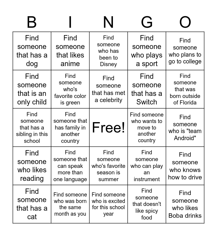 This bingo card has a free space and 24 words: Find someone that can speak more than one language, Find someone who was born the same month as you, Find someone that has met a celebrity, Find someone that has a cat, Find someone who plans to go to college, Find someone that has a dog, Find someone that is an only child, Find someone that likes anime, Find someone who wants to move to another country, Find someone who's favorite season is summer, Find someone that has a Switch, Find someone that has a sibling in this school, Find someone who can play an instrument, Find someone who knows how to drive, Find someone who's favorite color is green, Find someone that doesn't like spicy food, Find someone who is "team Android", Find someone who has been to Disney, Find someone that was born outside of Florida, Find someone that has family in another country, Find someone who likes Boba drinks, Find someone who likes reading, Find someone who plays a sport and Find someone who is excited for this school year.