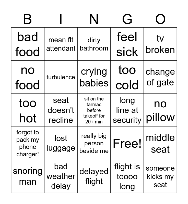 This bingo card has 25 words: lost luggage, delayed flight, crying babies, snoring man, tv broken, bad food, no food, mean flt attendant, long line at security, really big person beside me, too cold, too hot, Free!, middle seat, turbulence, someone kicks my seat, no pillow, dirty bathroom, change of gate, seat doesn't recline, sit on the tarmac before takeoff for 20+ min, bad weather delay, forgot to pack my phone charger!, feel sick and flight is toooo long.