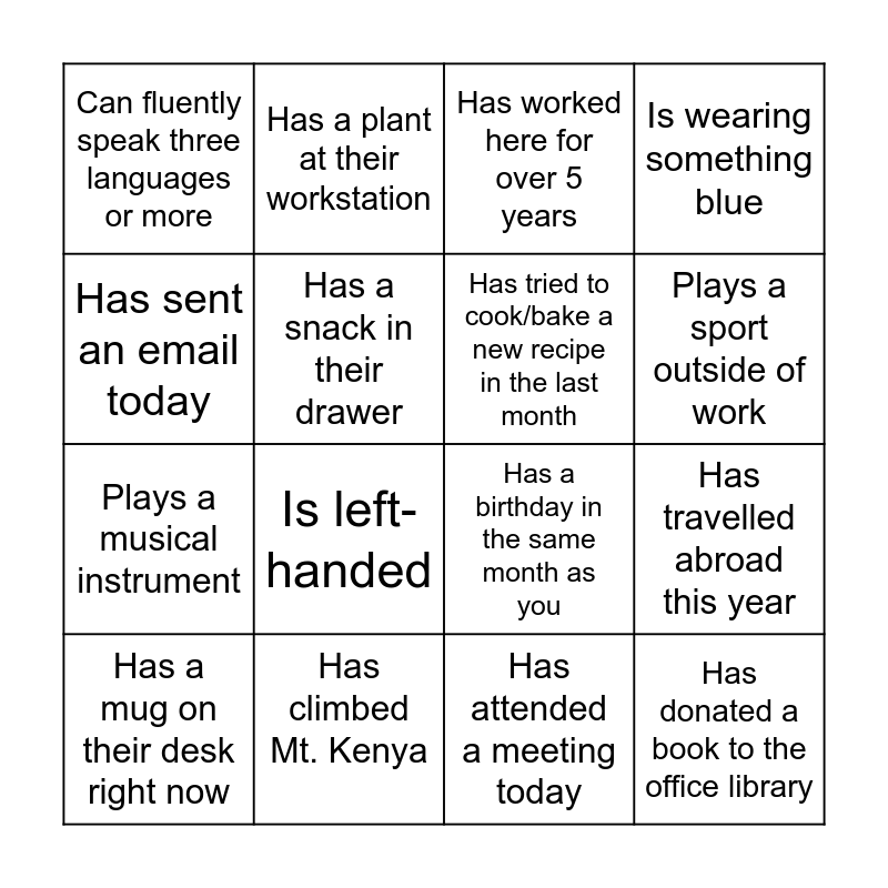 This bingo card has 16 words: Has a mug on their desk right now, Has climbed Mt. Kenya, Has worked here for over 5 years, Is wearing something blue, Has sent an email today, Has a plant at their workstation, Has a birthday in the same month as you, Has travelled abroad this year, Can fluently speak three languages or more, Has a snack in their drawer, Has attended a meeting today, Plays a sport outside of work, Plays a musical instrument, Is left-handed, Has tried to cook/bake a new recipe in the last month and Has donated a book to the office library.
