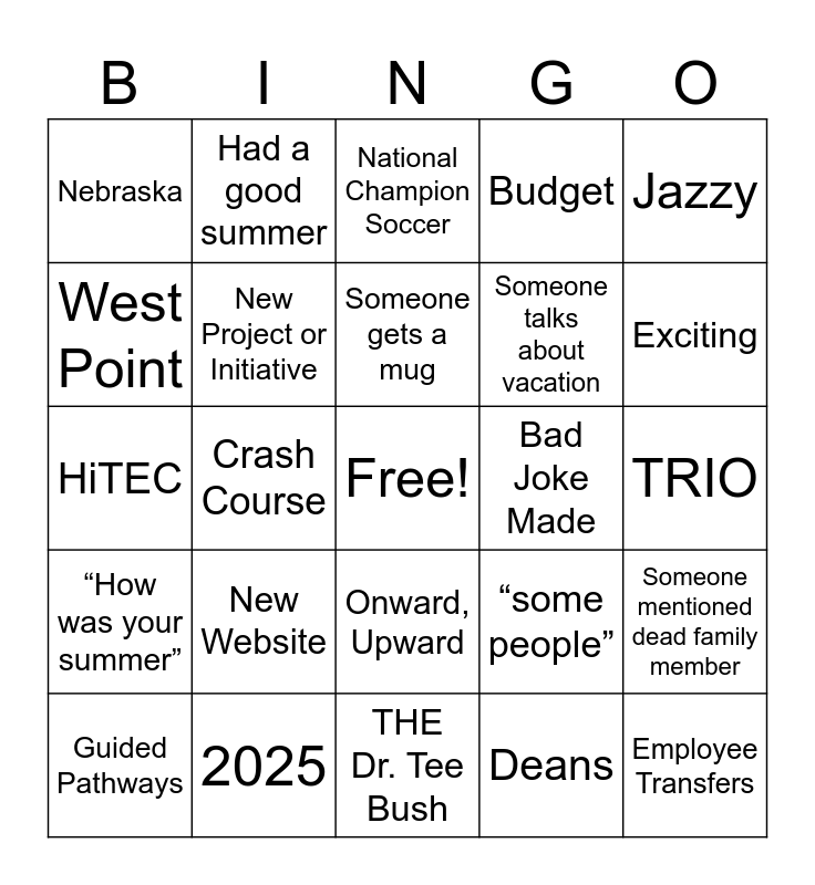 This bingo card has a free space and 44 words: Claws Down, Employee Transfers, Students, Guided Pathways, “Woo!”, Deans, National Champion Soccer, iHub, Jazzy, 2025, Budget, Bad Joke Made, Onward, Upward, New Website, Technology, THE Dr. Tee Bush, Pam Saalfeld!, HiTEC, New Mclay, Exciting, Had a good summer, SkillsUSA, “Challenges”, Nebraska, Wendy Swenson Laughs, TRIO, Standing Ovation, Someone spills a drink, “some people”, “How was your summer”, More Coffee!, Someone mentioned dead family member, Kory Hilderbrand, Adult Education, Crash Course, Technology Issue, Strategic, Award!, Someone gets a mug, West Point, Someone talks about vacation, Adult Education, New Project or Initiative and THE Lindsay S.!!!.