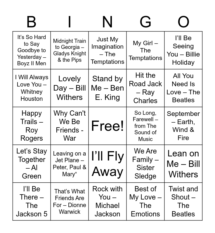 This bingo card has a free space and 24 words: Leaving on a Jet Plane – Peter, Paul & Mary“, That’s What Friends Are For – Dionne Warwick, Stand by Me – Ben E. King, I’ll Be There – The Jackson 5, I’ll Be Seeing You – Billie Holiday, It’s So Hard to Say Goodbye to Yesterday – Boyz II Men, I Will Always Love You – Whitney Houston, Midnight Train to Georgia – Gladys Knight & the Pips, So Long, Farewell – from The Sound of Music, I’ll Fly Away, Hit the Road Jack – Ray Charles, Happy Trails – Roy Rogers, We Are Family – Sister Sledge, Lean on Me – Bill Withers, Lovely Day – Bill Withers, Best of My Love – The Emotions, September – Earth, Wind & Fire, Just My Imagination – The Temptations, All You Need Is Love – The Beatles, Why Can't We Be Friends - War, Twist and Shout – The Beatles, Let’s Stay Together – Al Green, My Girl – The Temptations and Rock with You – Michael Jackson.
