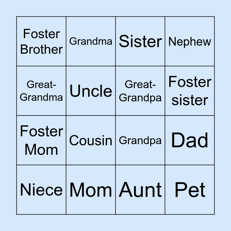 This bingo card has 16 words: Mom, Dad, Sister, Foster Brother, Foster Mom, Grandma, Grandpa, Aunt, Great-Grandma, Uncle, Niece, Nephew, Cousin, Foster sister, Great-Grandpa and Pet.