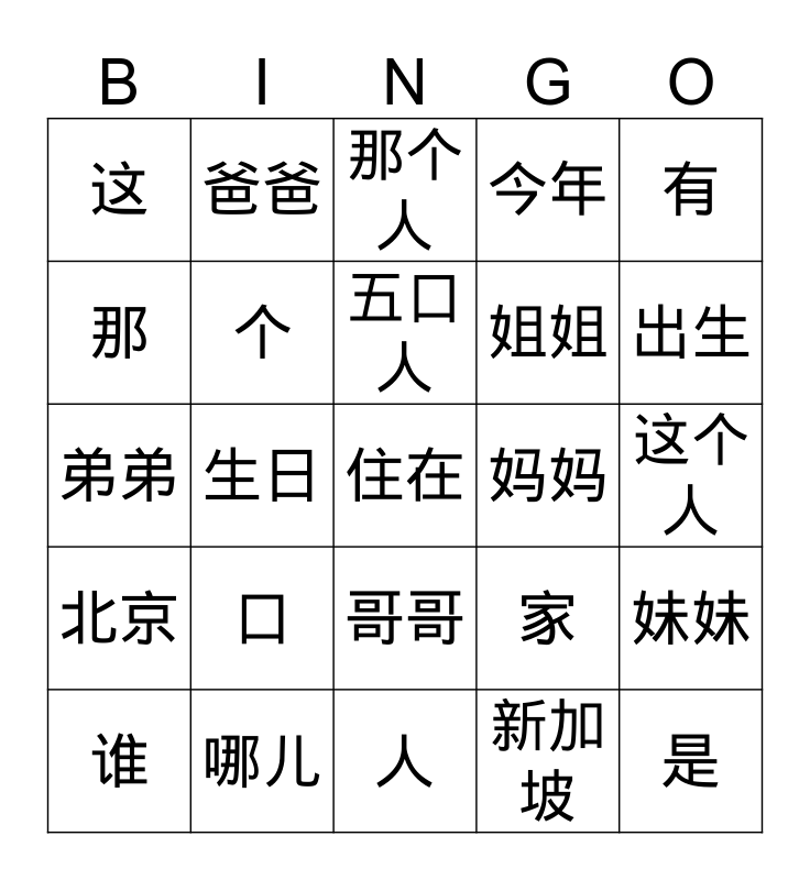 This bingo card has 25 words: 口, 人, 五口人, 谁, 有, 这, 那, 爸爸, 妈妈, 哥哥, 姐姐, 弟弟, 家, 妹妹, 个, 是, 这个人, 那个人, 出生, 生日, 住在, 哪儿, 北京, 今年 and 新加坡.