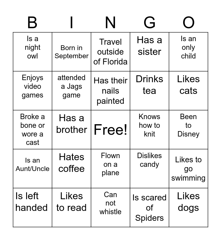 This bingo card has a free space and 24 words: Is left handed, Hates coffee, Has their nails painted, Is scared of Spiders, Is an only child, Is a night owl, Born in September, Travel outside of Florida, Knows how to knit, Been to Disney, Broke a bone or wore a cast, attended a Jags game, Dislikes candy, Likes to go swimming, Enjoys video games, Likes to read, Can not whistle, Has a sister, Likes cats, Is an Aunt/Uncle, Has a brother, Flown on a plane, Drinks tea and Likes dogs.