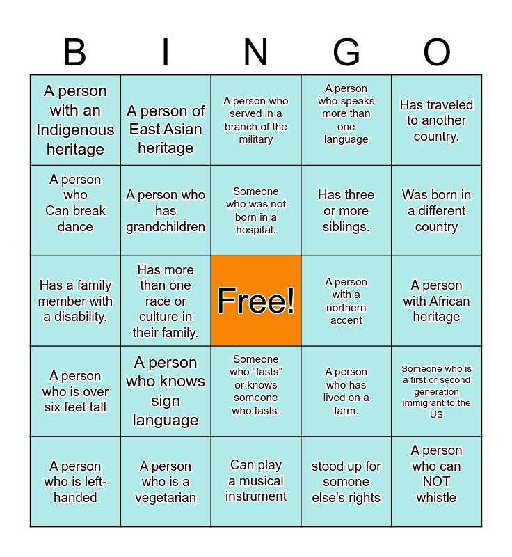 This bingo card has a free space and 24 words: A person who knows sign language, A person who is a vegetarian, Someone who was not born in a hospital., A person who is left-handed, Has traveled to another country., A person with an Indigenous heritage, A person who Can break dance, A person of East Asian heritage, A person with a northern accent, Someone who “fasts” or knows someone who fasts., Has three or more siblings., Has a family member with a disability., A person who has lived on a farm., Someone who is a first or second generation immigrant to the US, A person who has grandchildren, stood up for somone else's rights, A person with African heritage, A person who served in a branch of the military, Was born in a different country, Has more than one race or culture in their family., A person who can NOT whistle, A person who is over six feet tall, A person who speaks more than one language and Can play a musical instrument.