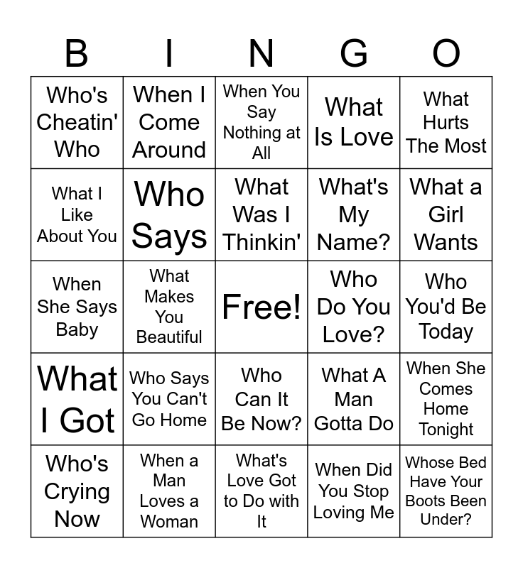 This bingo card has a free space and 39 words: Who's Your Daddy?, Who Let The Dogs Out, Who Knew, Who Says, Who's Crying Now, Who Can It Be Now?, What Was I Thinkin', What's Up?, What Hurts The Most, What I Got, What Makes You Beautiful, What Is Love, Whose Bed Have Your Boots Been Under?, Who You'd Be Today, Who Do You Love?, Who Says You Can't Go Home, Who's Lovin' You, Who's Cheatin' Who, What If, What A Man Gotta Do, What I Like About You, What's Love Got to Do with It, What's My Name?, What a Girl Wants, When I Was Your Man, When It Rains It Pours, When Doves Cry, When We Were Young, When the Sun Goes Down, When I Come Around, When Will I Be Loved, When I Grow Up, When You Say Nothing at All, When a Man Loves a Woman, When Did You Stop Loving Me, Who's Afriad of Little Old Me?, When She Comes Home Tonight, When She Says Baby and When I've Been Drinkin'.