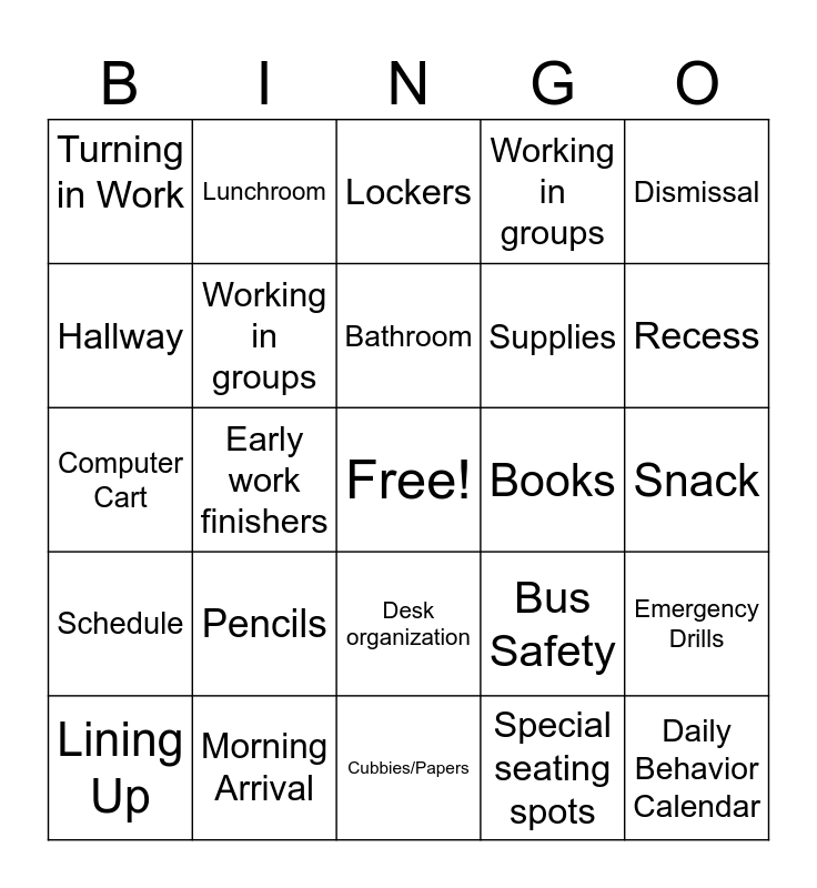 This bingo card has a free space and 24 words: Pencils, Morning Arrival, Bathroom, Lining Up, Dismissal, Turning in Work, Hallway, Lunchroom, Books, Desk organization, Supplies, Computer Cart, Bus Safety, Emergency Drills, Working in groups, Special seating spots, Snack, Lockers, Recess, Early work finishers, Daily Behavior Calendar, Schedule, Working in groups and Cubbies/Papers.