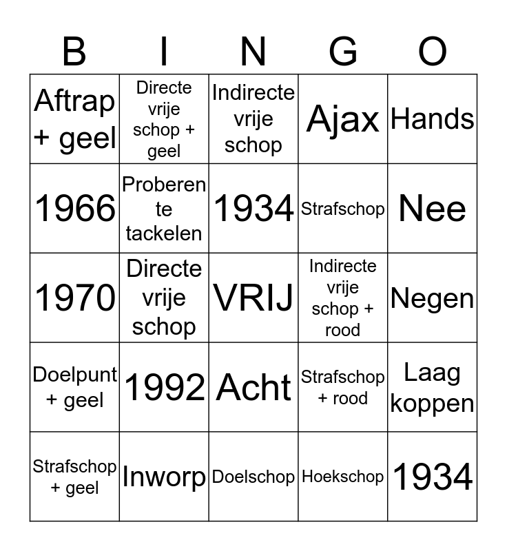 This bingo card has a free space and 35 words: Aftrap, NAC Breda, Indirecte vrije schop + geel, Proberen te tackelen, Acht, Ajax, 1966, Medespeler, 1934, Commentaar spelers, 1970, Hands, Scheidsrechtersbal, Zeven, Aftrap + geel, Indirecte vrije schop + rood, Hoekschop, Directe vrije schop, Doelpunt + geel, 1934, Strafschop + rood, Strafschop + geel, Laag koppen, Inworp, Indirecte vrije schop, Nee, Helmond Sport, Twaalf, Strafschop, Negen, Ja, Doelschop, 1992, Directe vrije schop + geel and Directe vrije schop + rood.
