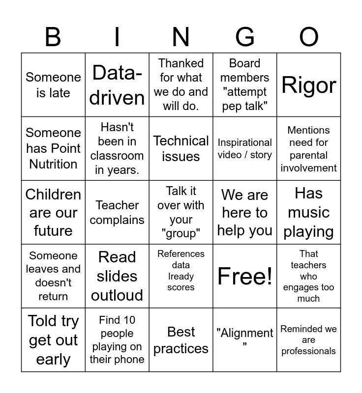 This bingo card has 25 words: Read slides outloud, Best practices, Technical issues, Told try get out early, Rigor, Someone is late, Someone has Point Nutrition, Data-driven, We are here to help you, References data Iready scores, Inspirational video / story, Children are our future, Free!, That teachers who engages too much, Hasn't been in classroom in years., Reminded we are professionals, Has music playing, Thanked for what we do and will do., Mentions need for parental involvement, Teacher complains, Talk it over with your "group", Find 10 people playing on their phone, Someone leaves and doesn't return, Board members "attempt pep talk" and "Alignment ".