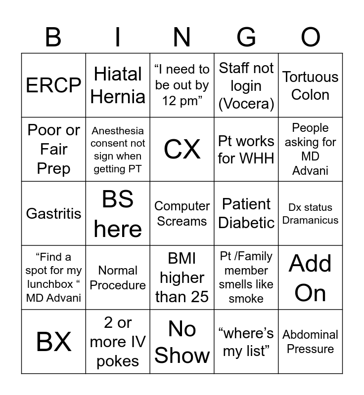 This bingo card has 25 words: Normal Procedure, No Show, CX, BX, Tortuous Colon, ERCP, Poor or Fair Prep, Hiatal Hernia, Patient Diabetic, BMI higher than 25, Pt works for WHH, Gastritis, Pt /Family member smells like smoke, Add On, Anesthesia consent not sign when getting PT, Abdominal Pressure, Dx status Dramanicus, “I need to be out by 12 pm”, People asking for MD Advani, BS here, Computer Screams, 2 or more IV pokes, “Find a spot for my lunchbox “ MD Advani, Staff not login (Vocera) and “where’s my list”.