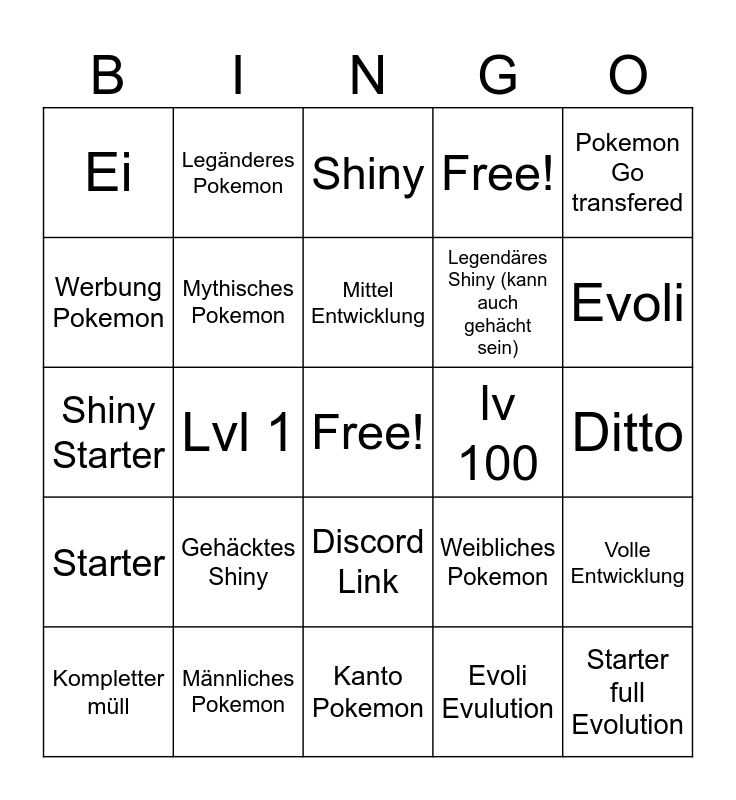 This bingo card has a free space and 24 words: Gehäcktes Shiny, Männliches Pokemon, Mittel Entwicklung, Kompletter müll, Pokemon Go transfered, Ei, Werbung Pokemon, Legänderes Pokemon, lv 100, Discord Link, Legendäres Shiny (kann auch gehächt sein), Shiny Starter, Weibliches Pokemon, Volle Entwicklung, Mythisches Pokemon, Evoli Evulution, Ditto, Shiny, Evoli, Lvl 1, Starter full Evolution, Starter, Free! and Kanto Pokemon.