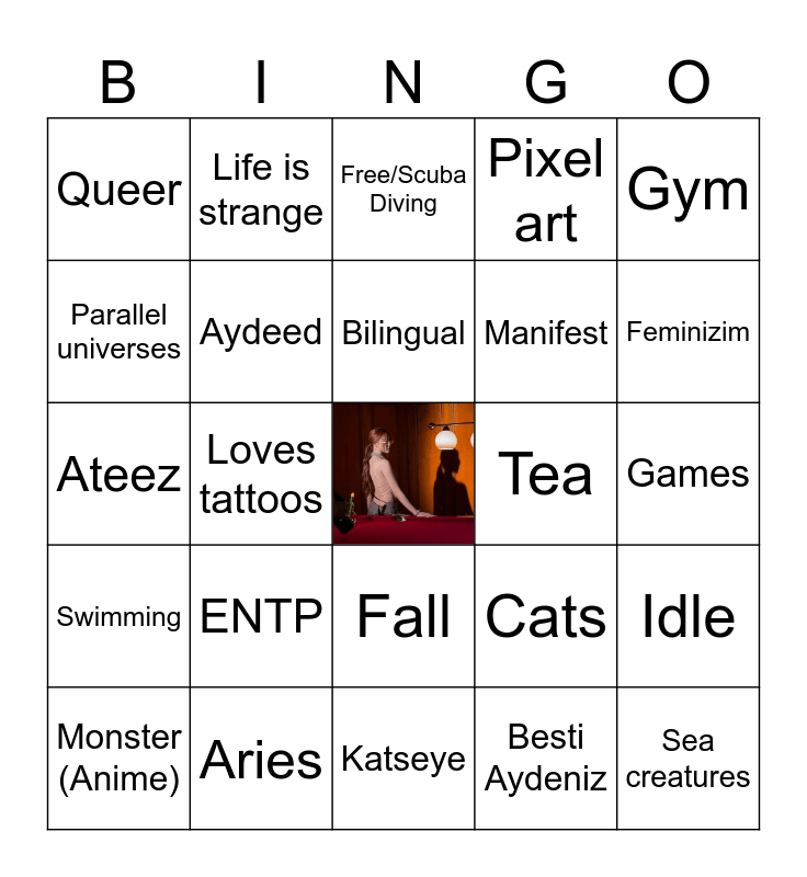 This bingo card has a free space and 24 words: ENTP, Aries, Bilingual, Monster (Anime), Gym, Queer, Parallel universes, Life is strange, Tea, Fall, Manifest, Ateez, Cats, Idle, Aydeed, Besti Aydeniz, Games, Free/Scuba Diving, Feminizim, Loves tattoos, Sea creatures, Swimming, Pixel art and Katseye.