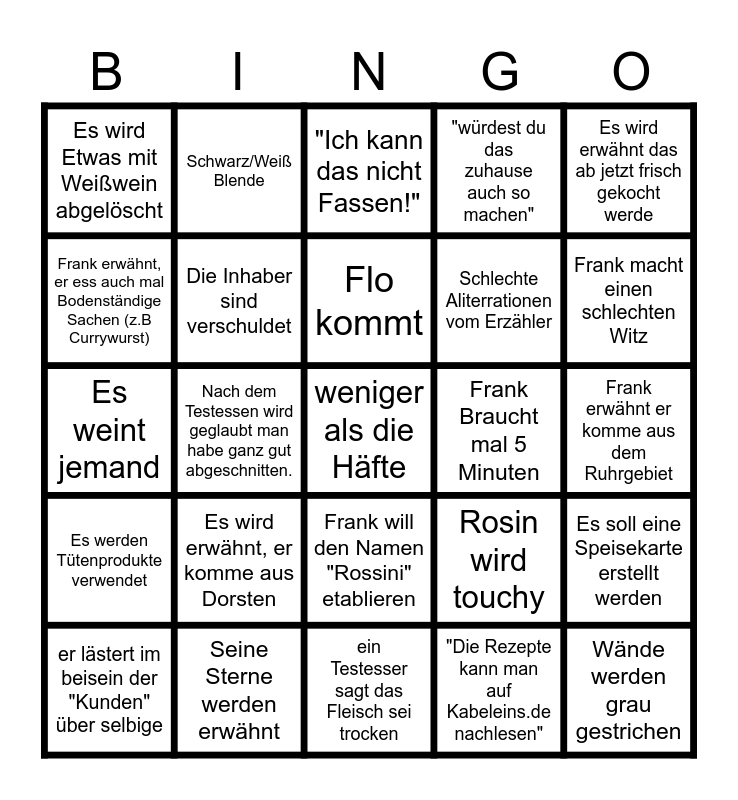 This bingo card has a free space and 24 words: Es wird erwähnt, er komme aus Dorsten, Seine Sterne werden erwähnt, Flo kommt, er lästert im beisein der "Kunden" über selbige, Es wird erwähnt das ab jetzt frisch gekocht werde, Es wird Etwas mit Weißwein abgelöscht, Frank erwähnt, er ess auch mal Bodenständige Sachen (z.B Currywurst), Schwarz/Weiß Blende, Frank Braucht mal 5 Minuten, Frank will den Namen "Rossini" etablieren, Schlechte Aliterrationen vom Erzähler, Es weint jemand, Rosin wird touchy, Es soll eine Speisekarte erstellt werden, Die Inhaber sind verschuldet, "Die Rezepte kann man auf Kabeleins.de nachlesen", Frank erwähnt er komme aus dem Ruhrgebiet, "Ich kann das nicht Fassen!", Frank macht einen schlechten Witz, Nach dem Testessen wird geglaubt man habe ganz gut abgeschnitten., Wände werden grau gestrichen, Es werden Tütenprodukte verwendet, "würdest du das zuhause auch so machen" and ein Testesser sagt das Fleisch sei trocken.