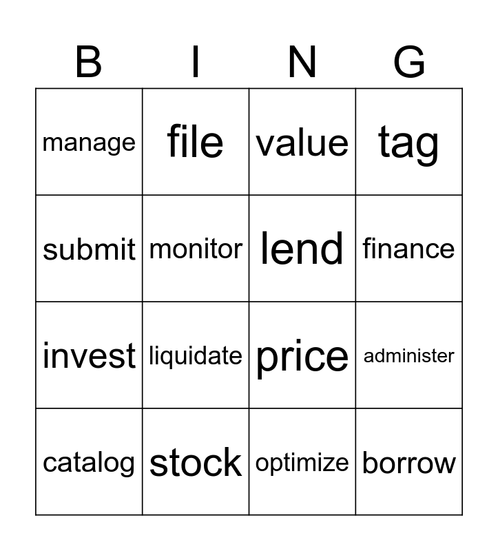 This bingo card has 16 words: stock, administer, value, manage, invest, file, price, optimize, submit, monitor, catalog, tag, liquidate, finance, lend and borrow.