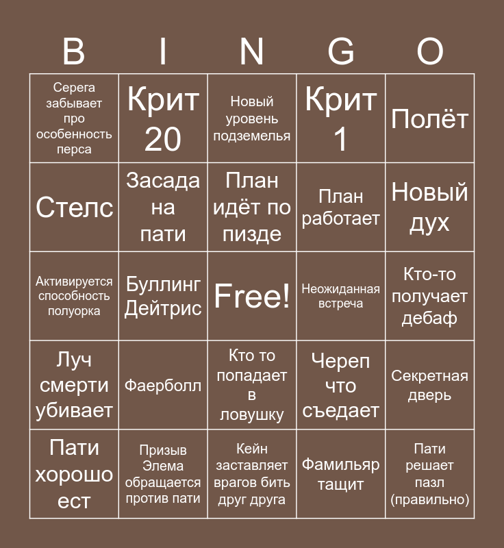 This bingo card has a free space and 24 words: Пати хорошо ест, Фаерболл, План идёт по пизде, Фамильяр тащит, Полёт, Серега забывает про особенность перса, Крит 20, Новый уровень подземелья, Неожиданная встреча, Кто-то получает дебаф, Активируется способность полуорка, Засада на пати, Череп что съедает, Секретная дверь, Стелс, Призыв Элема обращается против пати, Кейн заставляет врагов бить друг друга, Крит 1, Новый дух, Луч смерти убивает, Буллинг Дейтрис, Кто то попадает в ловушку, План работает and Пати решает пазл (правильно).