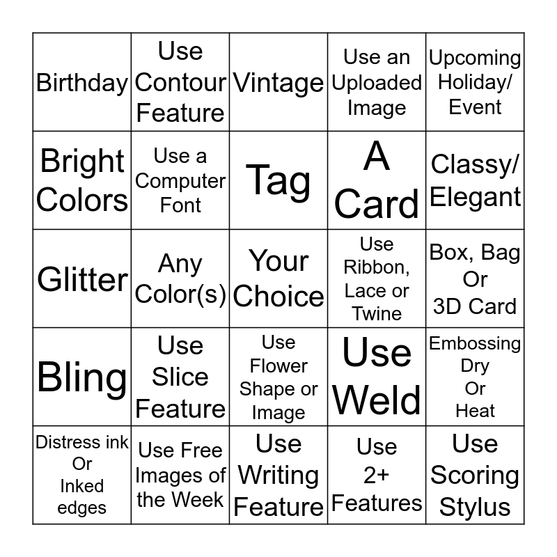 This bingo card has a free space and 24 words: Use Slice Feature, Use Free Images of the Week, Tag, Distress ink Or Inked edges, Upcoming Holiday/ Event, Birthday, Bright Colors, Use Contour Feature, Use Ribbon, Lace or Twine, Use Flower Shape or Image, A Card, Glitter, Use Weld, Embossing Dry Or Heat, Use a Computer Font, Use 2+ Features, Box, Bag Or 3D Card, Vintage, Classy/ Elegant, Any Color(s), Use Scoring Stylus, Bling, Use an Uploaded Image and Use Writing Feature.