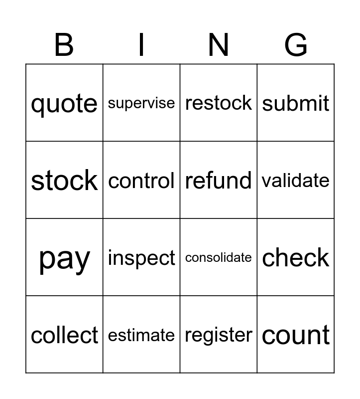 This bingo card has 16 words: estimate, check, restock, quote, pay, supervise, consolidate, register, stock, control, collect, submit, inspect, validate, refund and count.