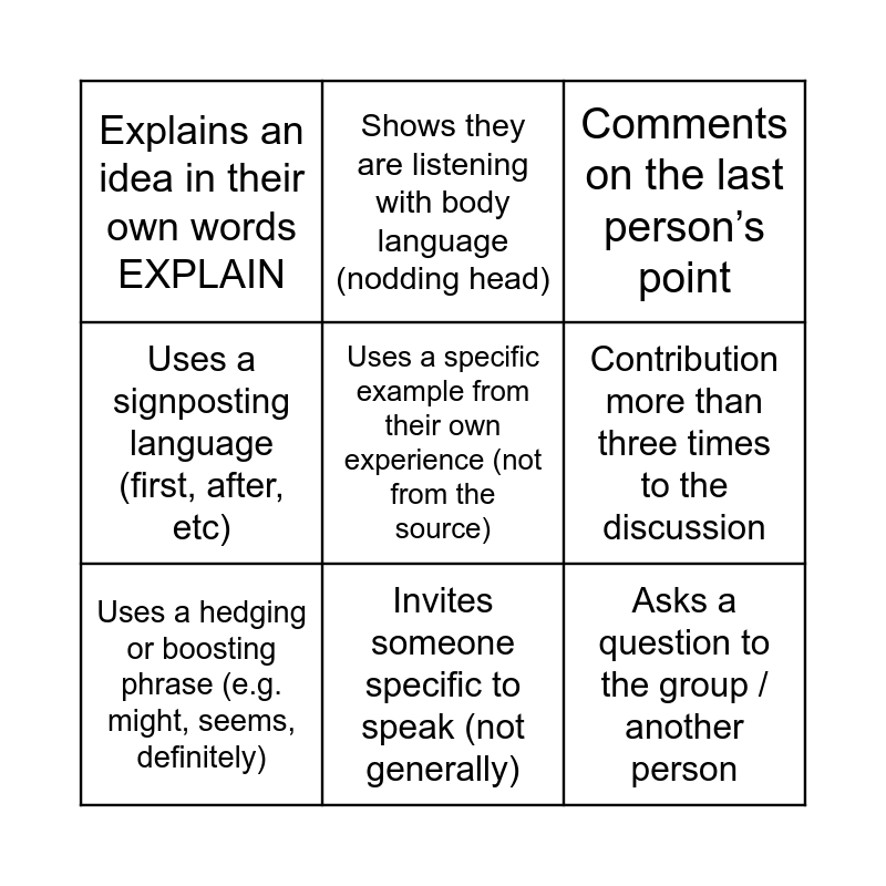 This bingo card has 13 words: Free!, Strong argument: refers to a source (e.g. Reeves, 2017 or ‘in the video’) EXAMPLE, Uses a hedging or boosting phrase (e.g. might, seems, definitely), Shows they are listening with body language (nodding head), Uses a signposting language (first, after, etc), Uses a specific example from their own experience (not from the source), Asks a question to the group / another person, Speaks without being invited, Invites someone specific to speak (not generally), Explains an idea in their own words EXPLAIN, Contribution more than three times to the discussion, Comments on the last person’s point and Good use of seminar language (Excuse me, could I interrupt).