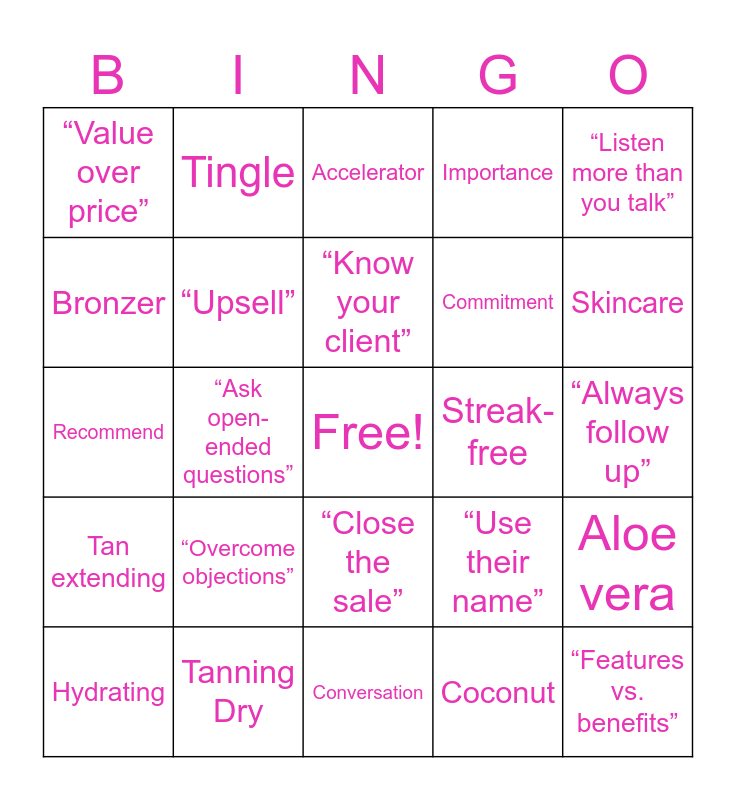 This bingo card has a free space and 28 words: Aloe vera, Hyaluronic acid, Commitment, Coconut, Bronzer, Accelerator, Tingle, Tan extending, Streak-free, Hydrating, Recommend, Importance, Tanning Dry, Conversation, Skincare, Antioxidants, “Overcome objections”, “Upsell”, “Know your client”, “Close the sale”, “Value over price”, “Build rapport”, “Features vs. benefits”, “Ask open-ended questions”, “Always follow up”, “Use their name”, “Listen more than you talk” and "Cost per session".