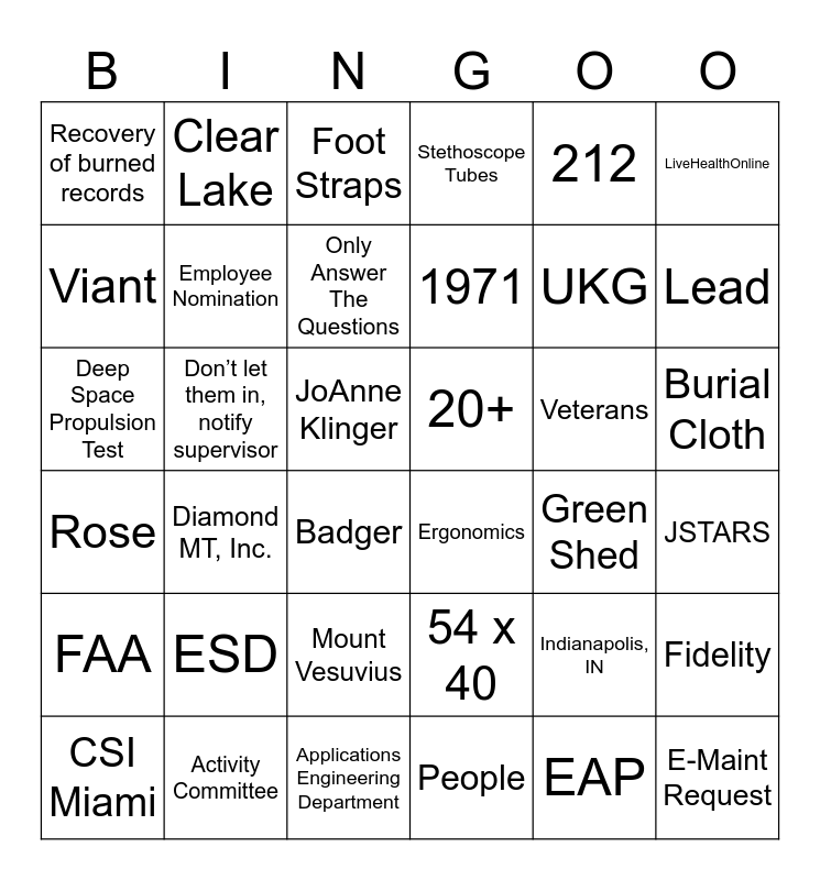 This bingo card has 59 words: Inclement Weather Hotline, Ergonomics, Date Step Completed, 20+, JSTARS, Novatran, Viant, Joby, Only Answer The Questions, Titanic, Stethoscope Tubes, Mind, LiveHealthOnline, CSI Miami, Vegas Synchronized Swimming, Recovery of burned records, Deep Space Propulsion Test, 212, Selvig, Employee Nomination, Don’t let them in, notify supervisor, Foot Straps, Badger, Diamond MT, Inc., Scoreboards, Activity Committee, Indianapolis, IN, John Gilbertson, 1971, People, 97%, Just Do It, Follow Your Process, Holocaust, Clear Lake, ESD, Good Documentation, Lead, Applications Engineering Department, UKG, Clear Lake Backpack Nutrition Program, Veterans, JoAnne Klinger, Volunteer Time Off, 54 x 40, Innovate, Children’s Trachea Tubes, Qualtrax, Burial Cloth, Green Shed, Sesame Street, E-Maint Request, Mount Vesuvius, Fidelity, EAP, Rose, CLPT, FAA and Connecticut.