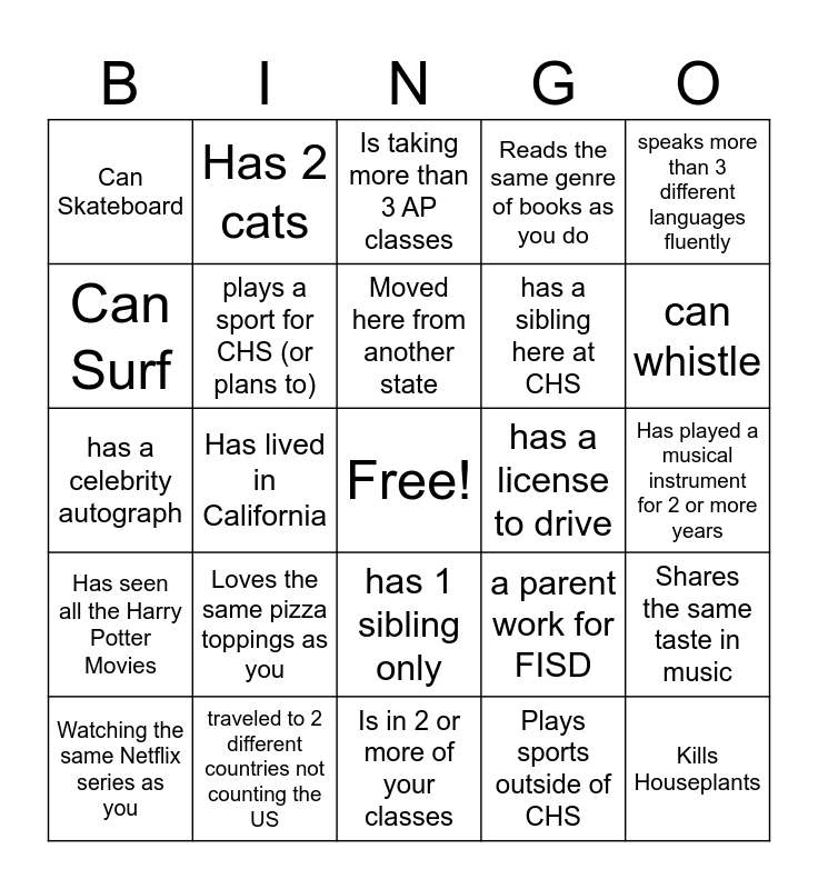 This bingo card has a free space and 24 words: Loves the same pizza toppings as you, traveled to 2 different countries not counting the US, Moved here from another state, Watching the same Netflix series as you, speaks more than 3 different languages fluently, Can Skateboard, Can Surf, Has 2 cats, has a license to drive, has 1 sibling only, has a sibling here at CHS, has a celebrity autograph, a parent work for FISD, Shares the same taste in music, plays a sport for CHS (or plans to), Plays sports outside of CHS, Has played a musical instrument for 2 or more years, Is taking more than 3 AP classes, can whistle, Has lived in California, Kills Houseplants, Has seen all the Harry Potter Movies, Reads the same genre of books as you do and Is in 2 or more of your classes.