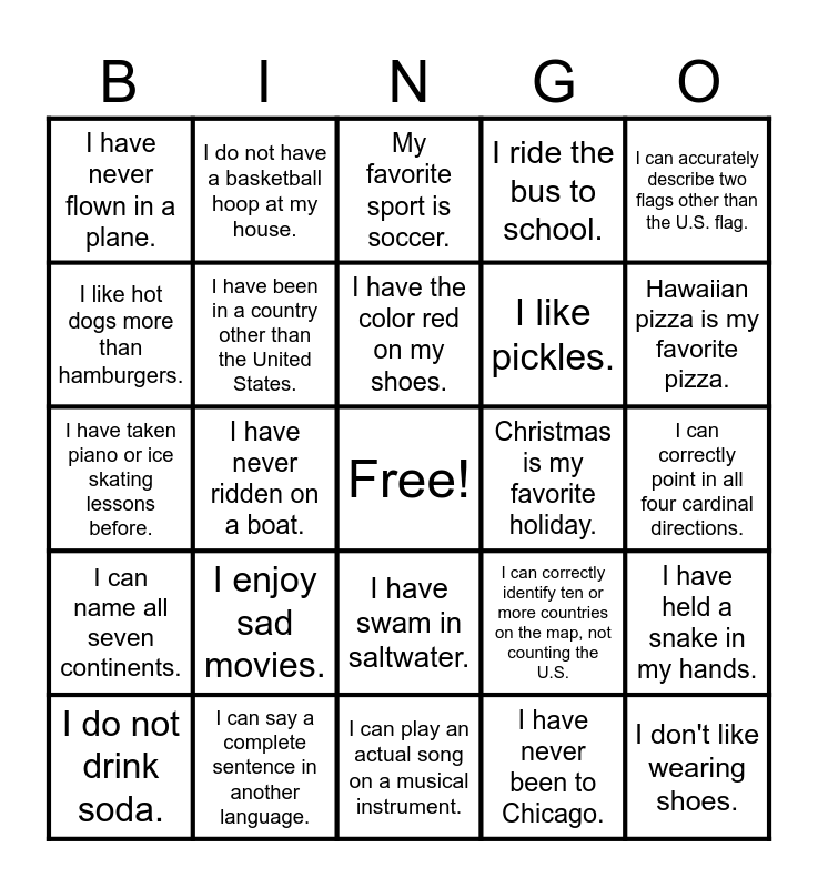 This bingo card has a free space and 34 words: I can name the leaders of three countries other than the U.S., I have never been to Chicago., I like to eat cereal., I have a pet rabbit., I can name all seven continents., I have been in a country other than the United States., I can accurately describe two flags other than the U.S. flag., I do not drink soda., I do not have a basketball hoop at my house., I have more than two pairs of Crocs., I have the color red on my shoes., My favorite sport is soccer., I enjoy drawing., My birthday is in either October or May., Christmas is my favorite holiday., Hawaiian pizza is my favorite pizza., I can say a complete sentence in another language., I have taken piano or ice skating lessons before., I enjoy sad movies., I can correctly identify ten or more countries on the map, not counting the U.S., I have swam in saltwater., My family has a white vehicle., I have never flown in a plane., I can correctly point in all four cardinal directions., I can play an actual song on a musical instrument., I don't like wearing shoes., I ride the bus to school., I have more than two pets at home., I like pickles., I like hot dogs more than hamburgers., I didn't wake up until after 7:30 this morning., I have never ridden on a boat., I have held a snake in my hands. and I have climbed a tree..