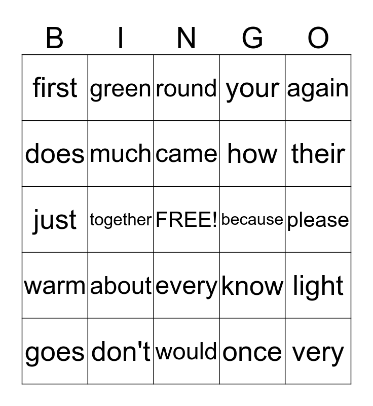 This bingo card has a free space and 24 words: about, don't, came, goes, again, first, does, green, because, every, how, just, know, light, much, once, please, round, their, together, very, warm, your and would.