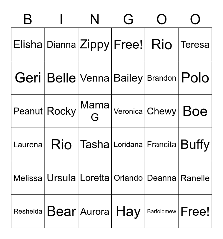 This bingo card has 42 words: Barfolomew, Belle, Turi, Chewy, Buffy, Rio, Peanut, Bingo, Zippy, Boe, Mama G, Bailey, Polo, Rio, Bear, Laurena, Ranelle, Brandon, Free!, Dianna, Teresa, Loretta, Melissa, Elisha, Sharon, Reshelda, Venna, Melissa S, Ursula, Deanna, Andreana, Veronica, Geri, Francita, Aurora, Tasha, Loridana, Rocky, Orlando, Hay, Free! and Free!.
